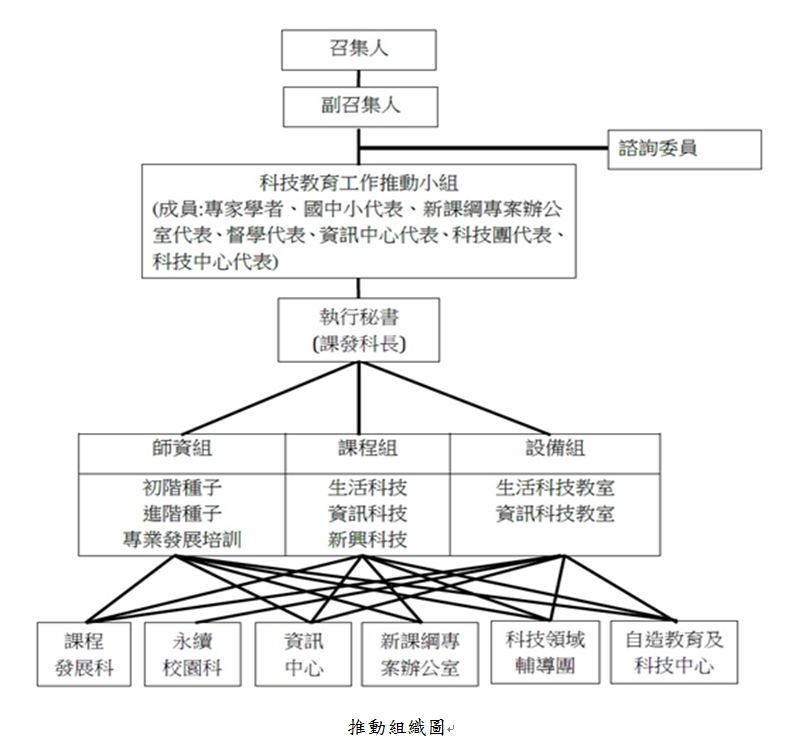 依據「教育部國民及學前教育署補助國民中學與國民小學推動十二年國民基本教育科技領域課程作業要點」,督導各國中落實每週2節生活科技與資訊科技教學之課程,以培養學生具備「做、用、想」的科技素養。聘用國民中小學科技教育合格教師,同時透過科技領域輔導團與自造教育及科技中心持續推動教師增能,以充實及強化科技領域教師。